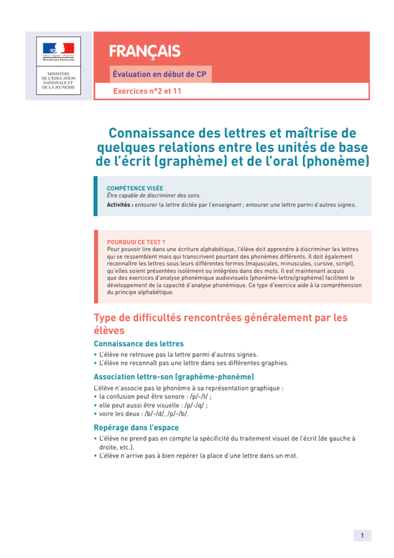 Ev18 C2 Francais Connaissance Lettres Maîtrise Relation Graphème Phonème E2 E11