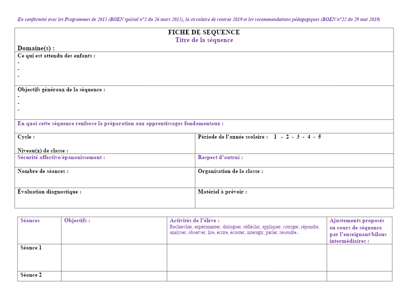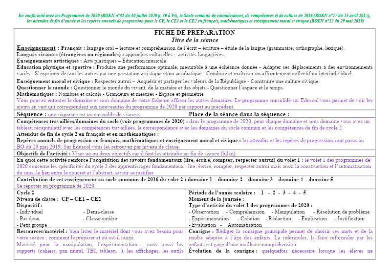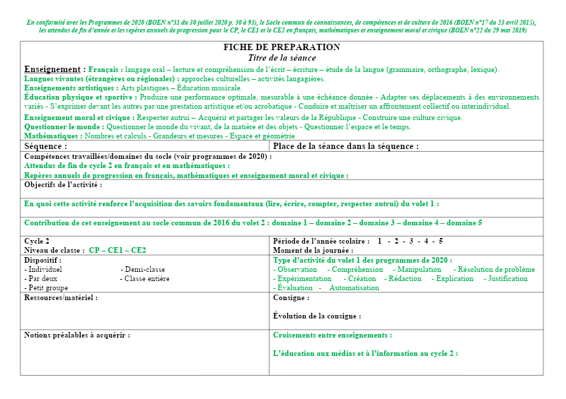 Fiche de préparation/ Modèle vierge cycle 2/ Programme de 2020