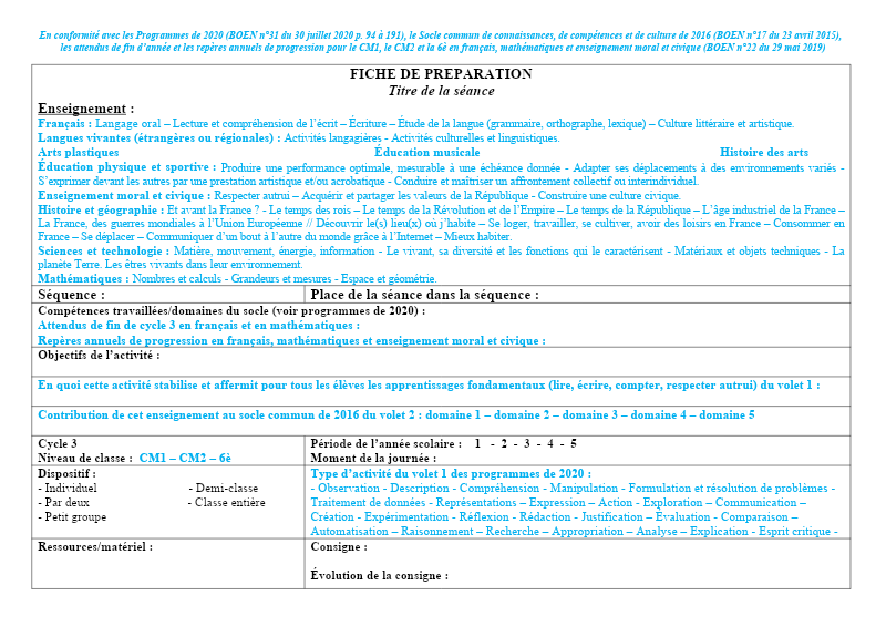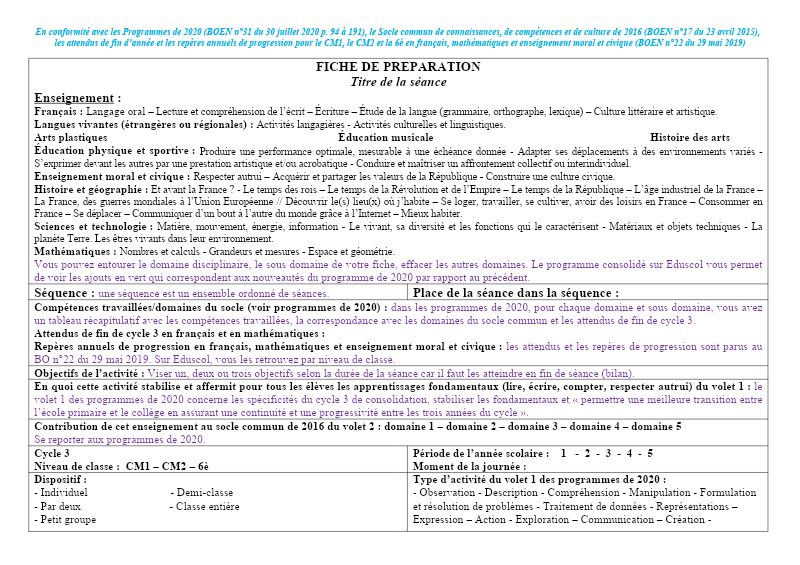 Fiche de préparation/ Modèle vierge cycle 3/ Programme de 2020