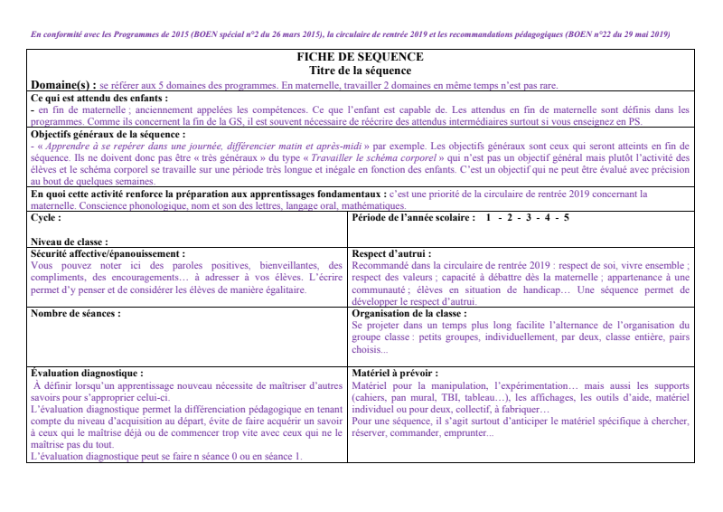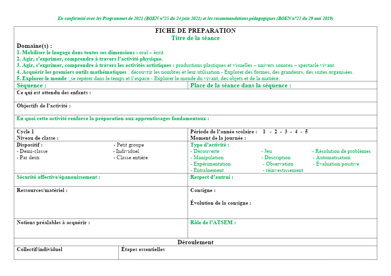 Fiche de Préparation/ Modèle vierge cycle 1/ Programme Maternelle 2021