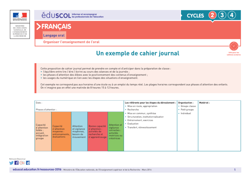 Un exemple de cahier journal dont les plages horaires correspondent aux phases d’attention des enfants