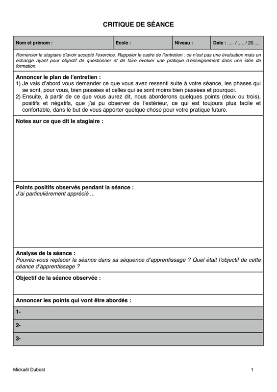 Exemple de grille d'analyse pour la critique de séance ( Mickaël DUBOST )