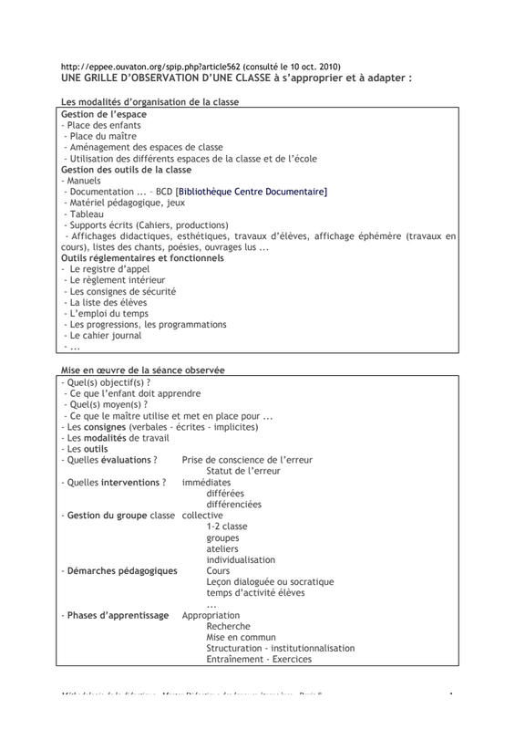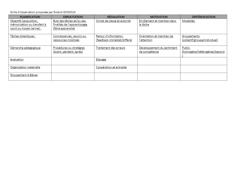 Grille d'observation de séance/ Le modèle de Roland GOIGOUX.