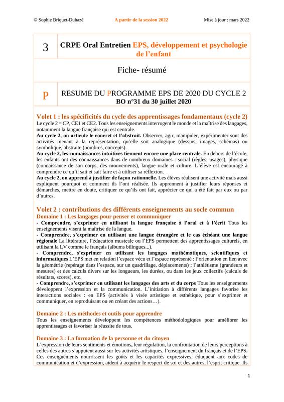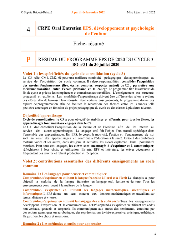 CRPE Oral /Programme EPS de 2020 du cycle 3.