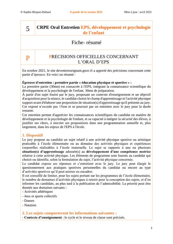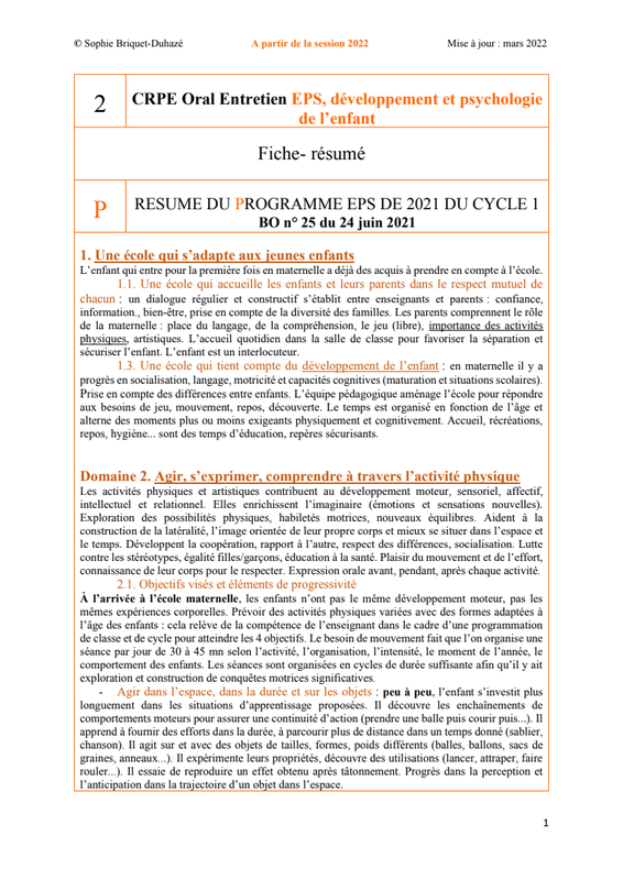 CRPE Oral/ Programme Eps de 2021 du cycle 1.